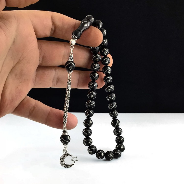 Gümüş İşlemeli Ay Yıldız Model Ateş Kehribar Tesbih